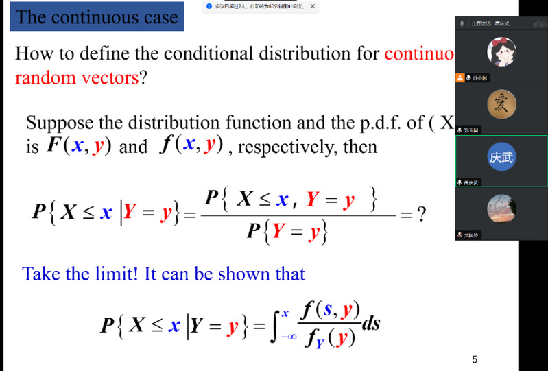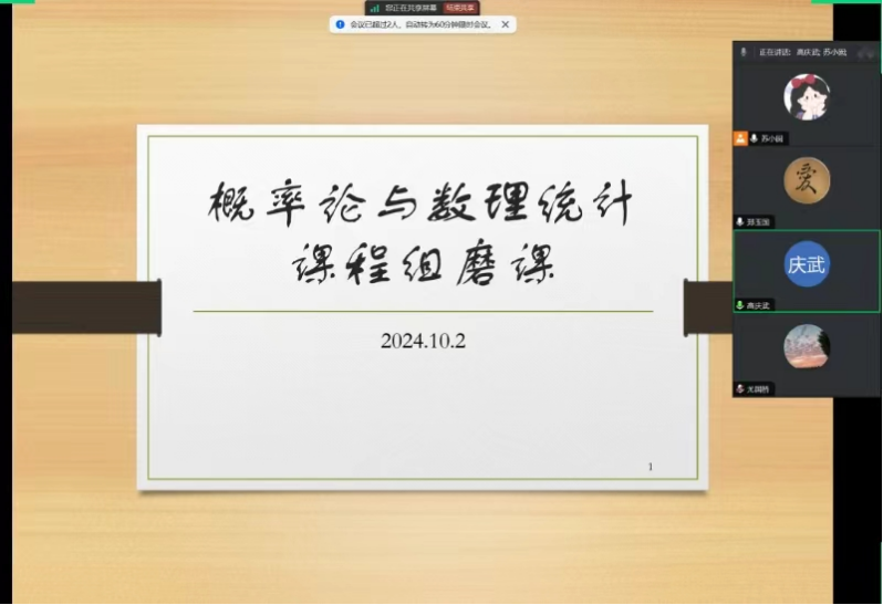 10月2日下午,《概率论与数理统计》课程组通过腾讯会议举行了第三章《多维随机变量及其分布》的磨课活动。本次会议由苏小囡、郑玉国、高庆武和尤国桥四位老师主讲,围绕第三章内容进行了细致的教学设计研讨。磨课活动旨在通过教师间的深入交流,进一步优化教学设计,提升教学水平,提高教学效果。