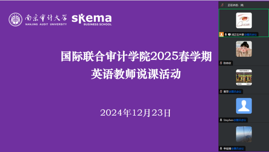 12月23日,为推动公司研究导向型教学改革,以立德树人为根本任务,进一步提升英语教学质效,国际联合审计公司举行了2025春学期英语教师线上说课活动。教学副经理李庭燎、国际联合审计公司英语课程组组长曹萍及教务秘书陈菲依出席,活动由李庭燎主持。