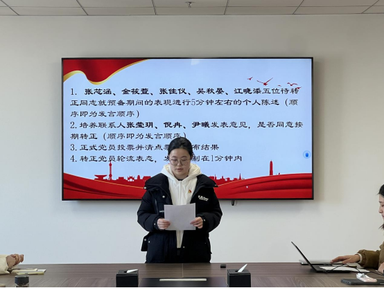 倪冉、尹曦就张芯涵等5位预备党员在预备期间的表现进行评议,张芯涵等5位预备党员在预备期一年表现良好,同意5位同志按期转正。经无记名投票表决,参会9名正式党员一致通过张芯涵等5位同志到期转正。5名新转正党员依次进行发言表态。