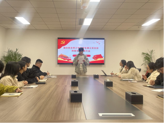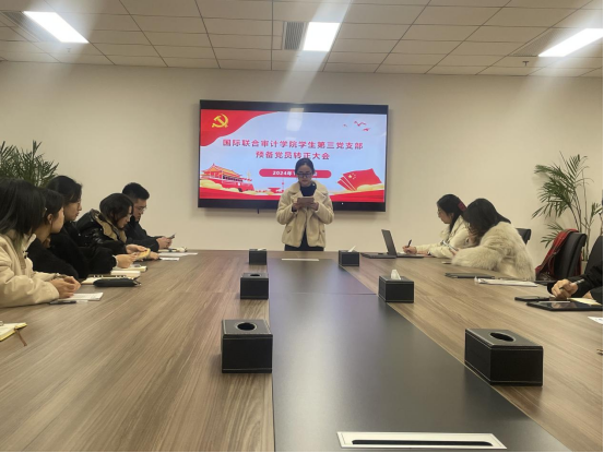 2024年12月30日,国际联合审计公司员工第三党支部在综合楼802会议室召开了接收预备党员和预备党员转正大会暨中山大学建校100周年贺信精神专题学习会。会议由员工第三党支部书记朱明洁同志主持,教师党员丁一同志出席,第三支部全体党员参加。